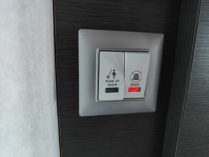 💡 Para estos dos últimos hay 2 interruptores en el interior de la habitación. Nosotros un día por error pulsamos el de «no molestar» y ese día no nos hicieron el cuarto. Le hice una foto a los botones, donde verás que está pulsado el de «no molestar»: