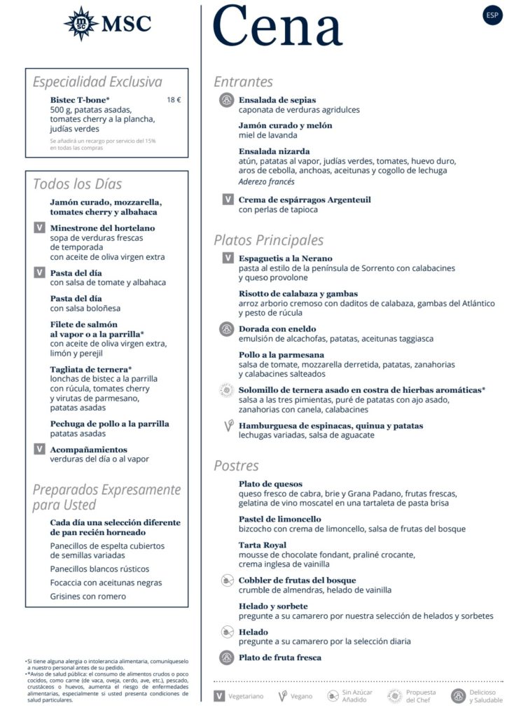 💡 En el APP, durante la travesía y si está conectado a la Wifi del barco podrás ver los restaurantes y sus menús de comida y cena (los de celiacos no). Así cuando te sientes en la mesa, ya sabrás qué pedir e irá todo más rápido.