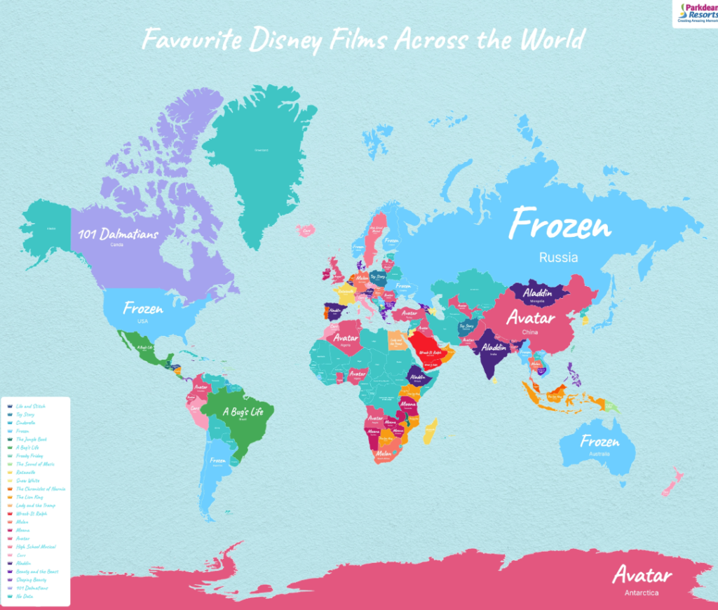 ¿Cuál es la película preferida de Disney en España? ¿Y en México? Desde parkdeanresorts, el 24/04/20 publicó un mapa mundial con las películas favoritas de la gente por país. Datos muy curiosos, aunque parece haber cierta relación entre las películas cuyas tramas se desarrollan en un país y que sean populares en dicho país. Hay excepciones como grandes hits que son las favoritas mundiales indistintamente. Así mismo, hay películas como Frozen II que estuvo disponible en España en Disney+ la semana pasada que no se ha tenido en cuenta a nivel mundial.
