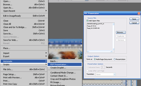 Para Fusionar varios PDFs con Photoshop debes: Abrir los archivos PDF a fusionar en Photoshop y con la misma calidad Archivo – Automatizar – Presentación PDF Añadir los PDFs abiertos. Se puede cambiar su orden arrastrando los nombres. Opciones de calidad y guardado del PDF